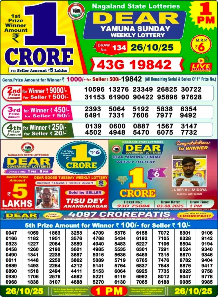 The Nagaland State Lottery announces its results for Sunday, 26 October 2025. Today’s draws include DEAR YAMUNA MORNING (1 PM), DEAR VIXEN EVENING (6 PM), and DEAR TOUCAN NIGHT (8 PM). Each draw offers a first prize of ₹1 Crore, along with multiple second and consolation prizes.